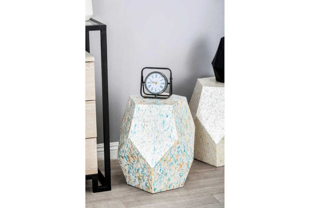 This exquisite 16 Inch Shell Pentagon Faceted Multi-Color Drum Accent Table boasts a modern style and is expertly crafted from Mother of Pearl, making it a truly unique piece. Its easy assembly allows you to quickly add a touch of elegance to any room in your home.
