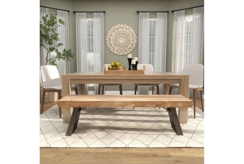 This Industrial Metal And Wood Bench is an assembly-required, light brown dining room bench made from mango wood and iron. Featuring an industrial-inspired design with clean lines and a natural wood grain pattern, this rustic brown bench is a sturdy and simplistic addition to any indoor space.