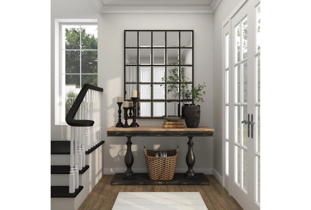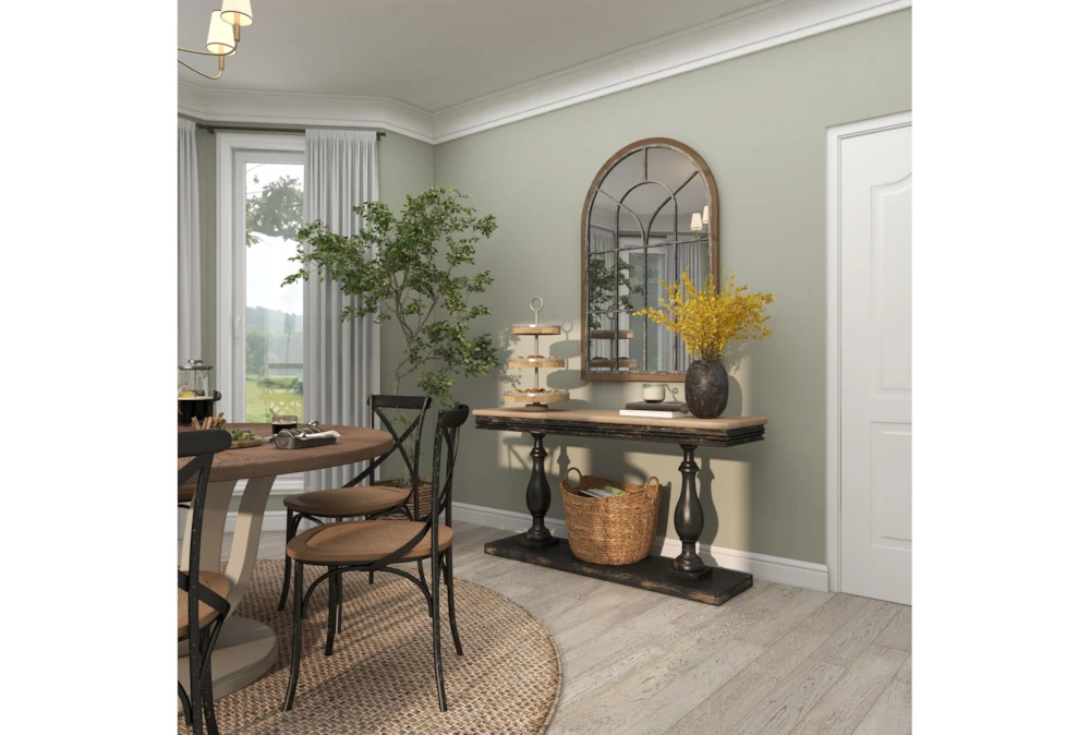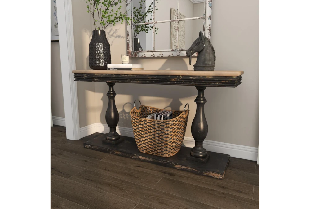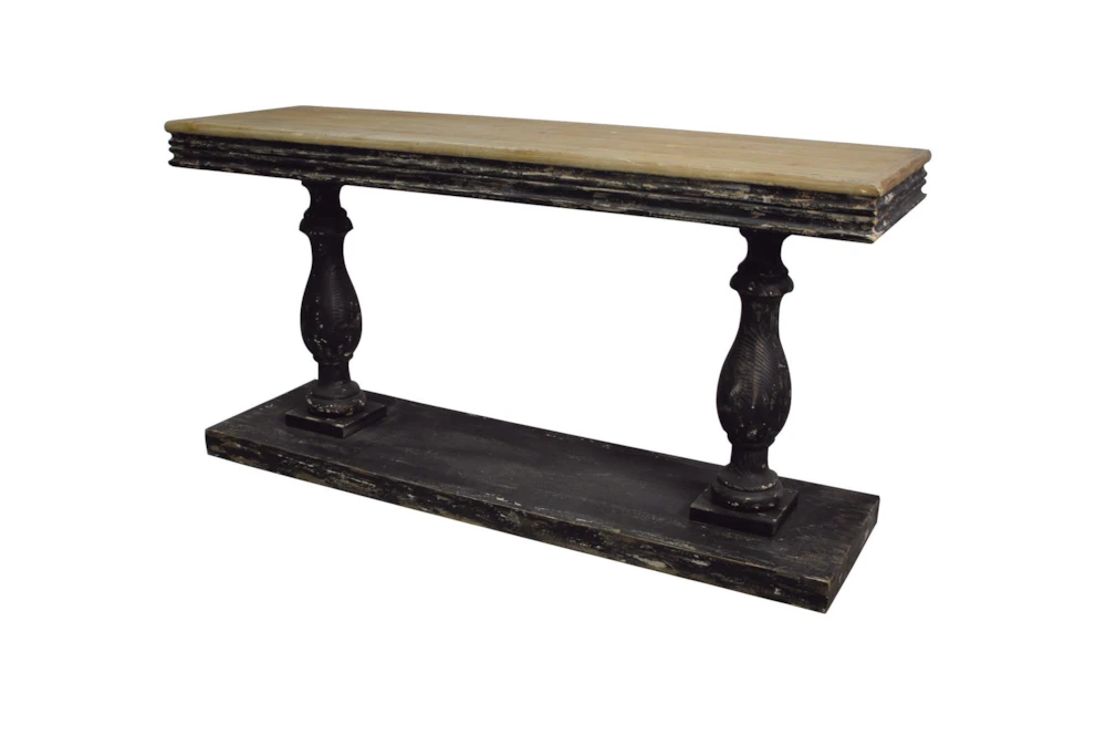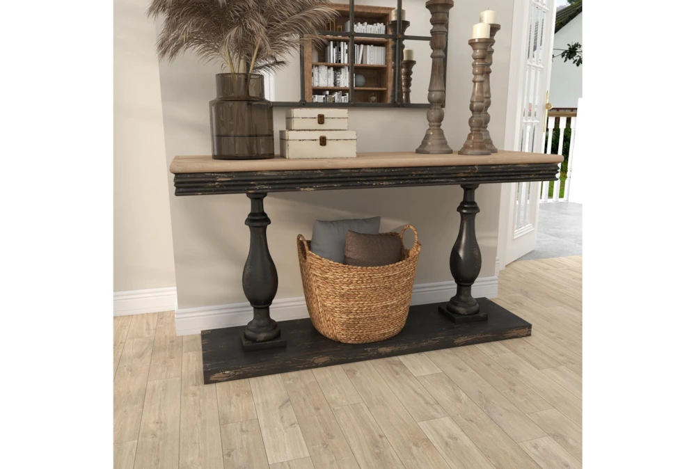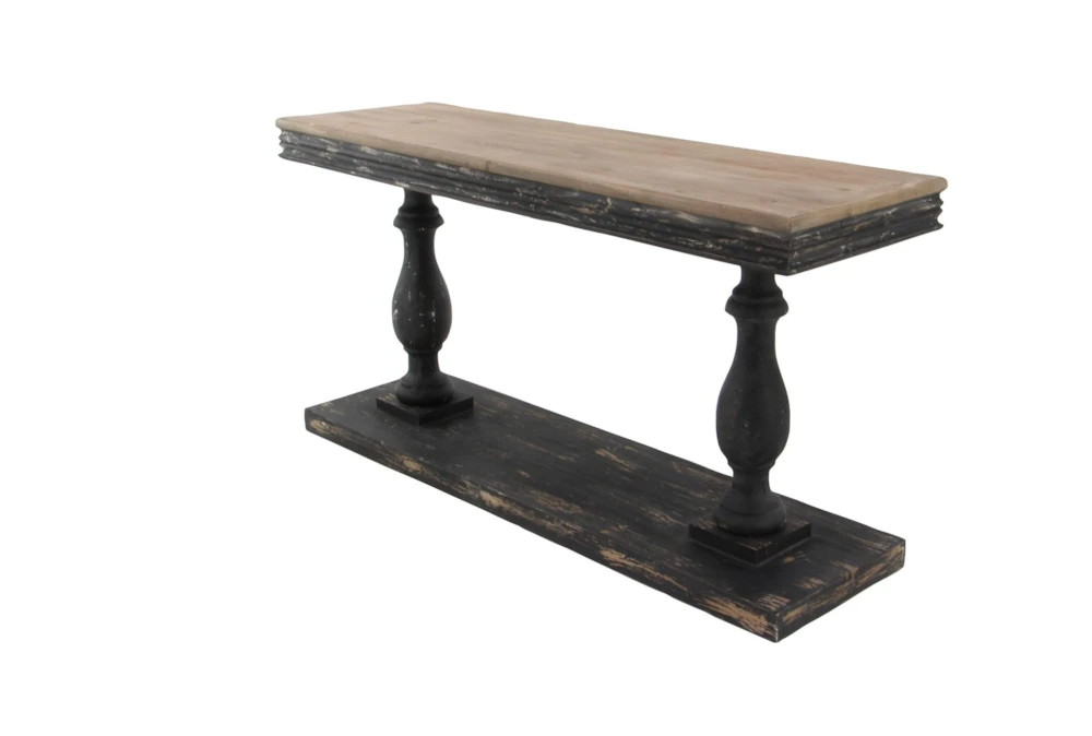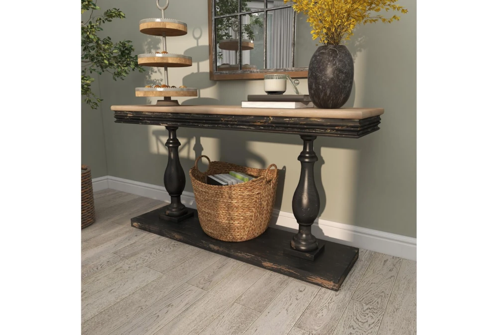 The Black Traditional 59″ Console Table is a sophisticated addition to any living room, featuring a vintage-inspired design and reliable construction from fir wood. This tall, curved pedestal table showcases a natural wood grain and light beige hue tabletop with distressed black legs and base, and requires assembly upon delivery.