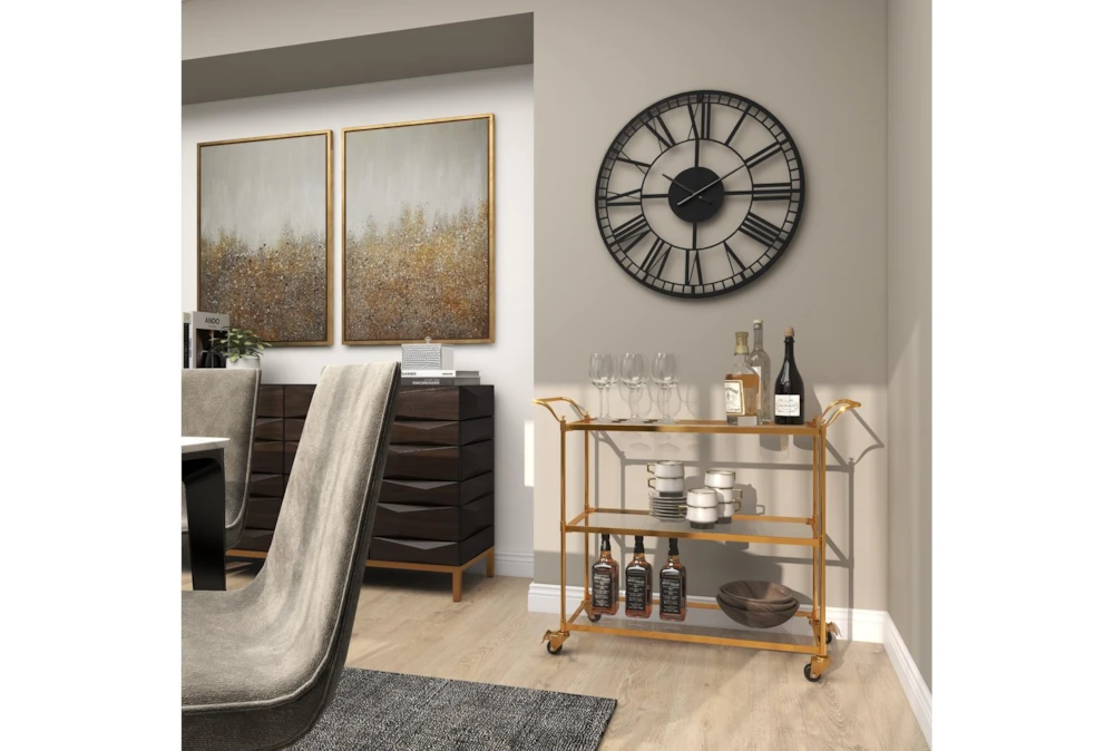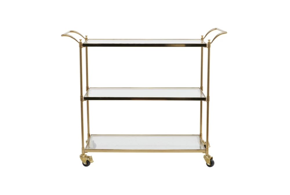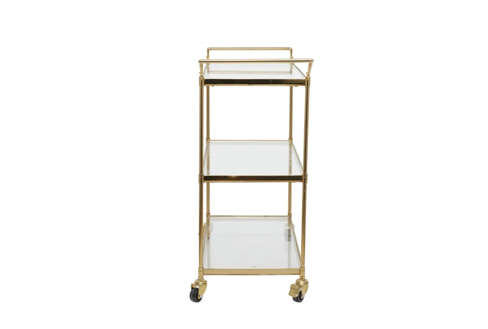 This Brass Rolling Bar Cart is a traditional style storage cart made of robust glass and metal materials, featuring 3 transparent glass shelves, a gold-finished frame, side handles, and caster wheels for optimal mobility. Assembly is required.