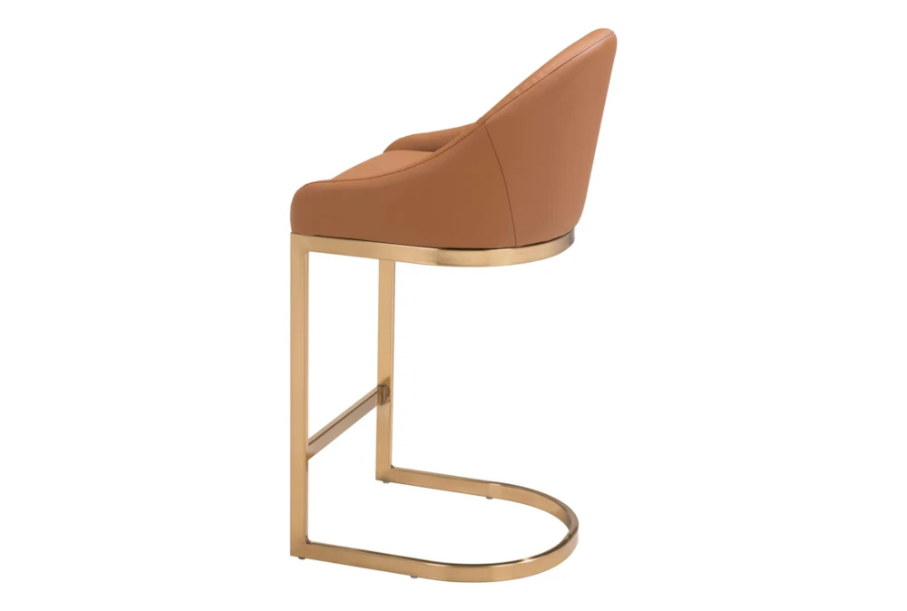 This contemporary tan counter stool is a tall, curved, armless stool with a back made of metal and wood, upholstered in beige fabric. Perfect for any dining room, this stool requires assembly and has a seating capacity of 1.