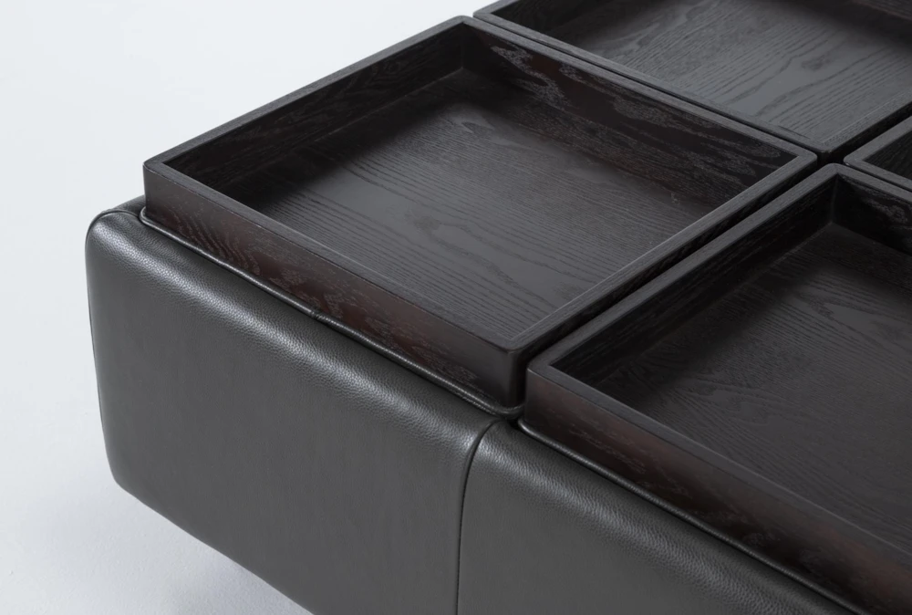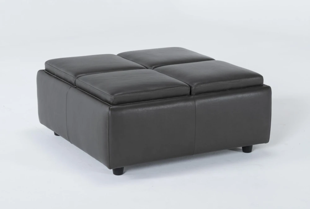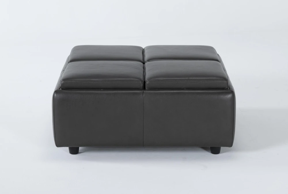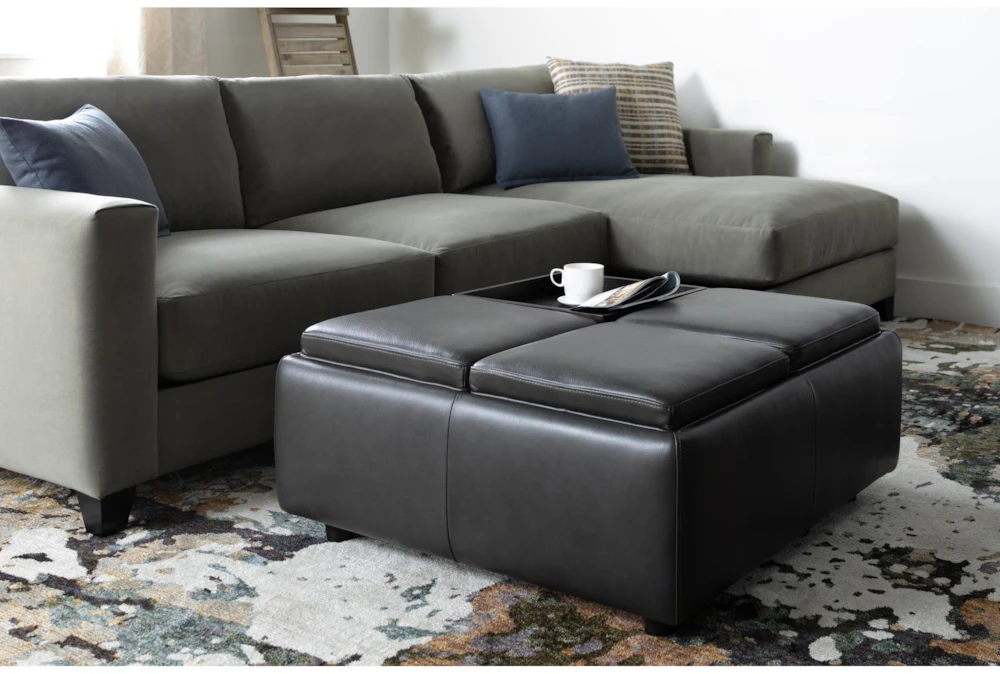Our Dorian storage ottoman is built for function with a divided top that has 4 sections, which flip to an upholstered side and tray side.
