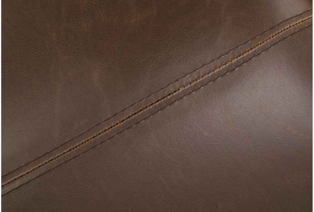 - Made with fabric and metal, with a brown faux leather bucket seat