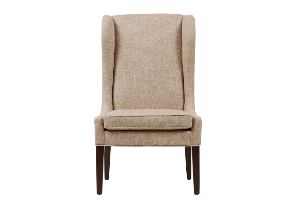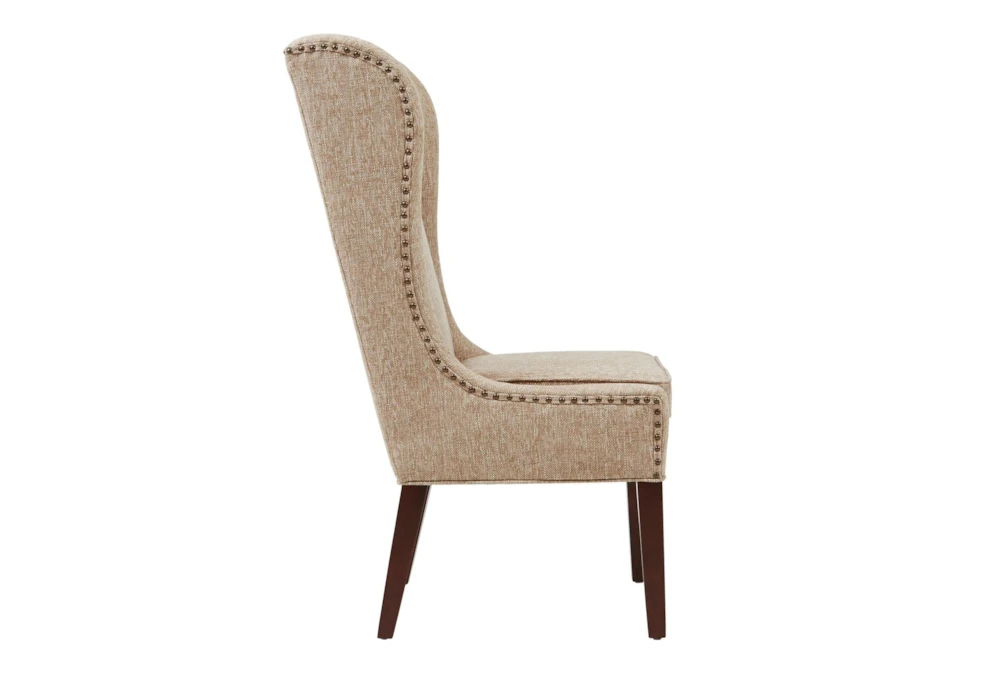 The Edward Beige Wingback Dining Chair boasts a traditional style and high back, made from select hardwoods and plywood with birch legs and an espresso finish. Its beige fabric composition is 73% polyester and 27% acrylic, featuring high density foam cushioning and bronze nail head detailing, with a loose seat and assembly required.