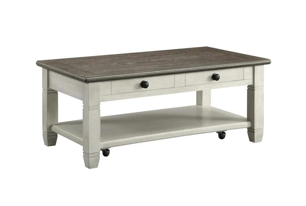 This elegant Every Two Tone Brown/White Storage Coffee Table with Wheels is perfect for your casual living room. With ample storage and drawers, shelves, and casters, this table is both functional and stylish. Assembly is required and it ships via UPS Parcel Shipping.