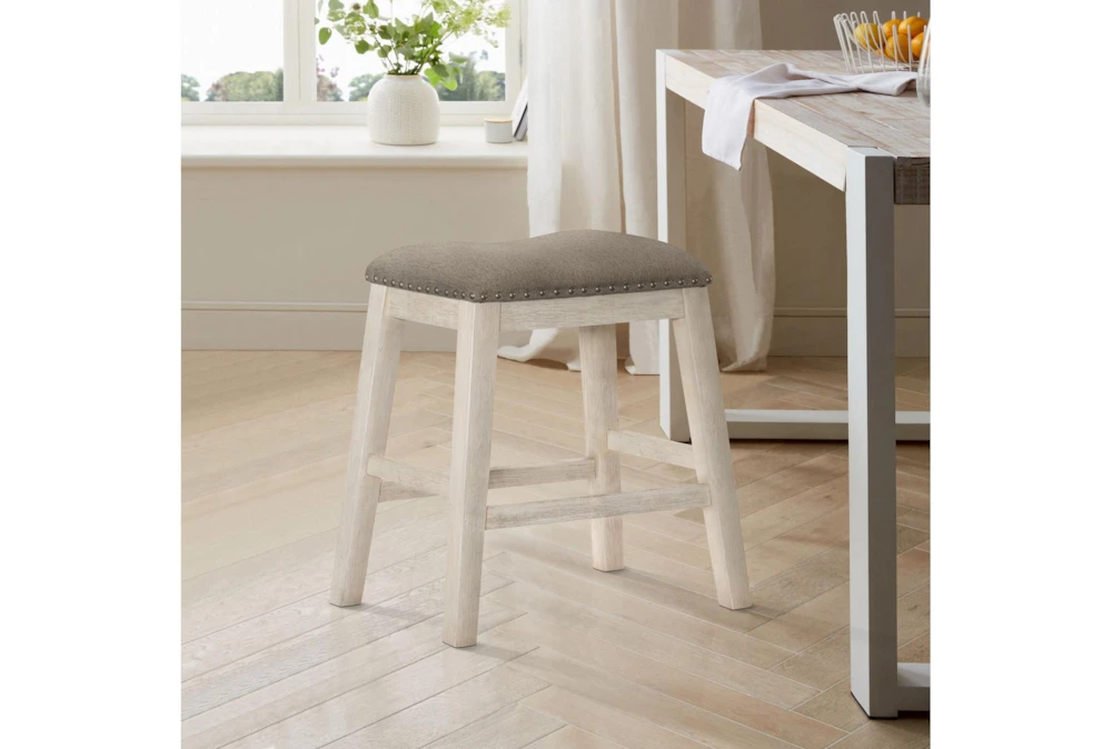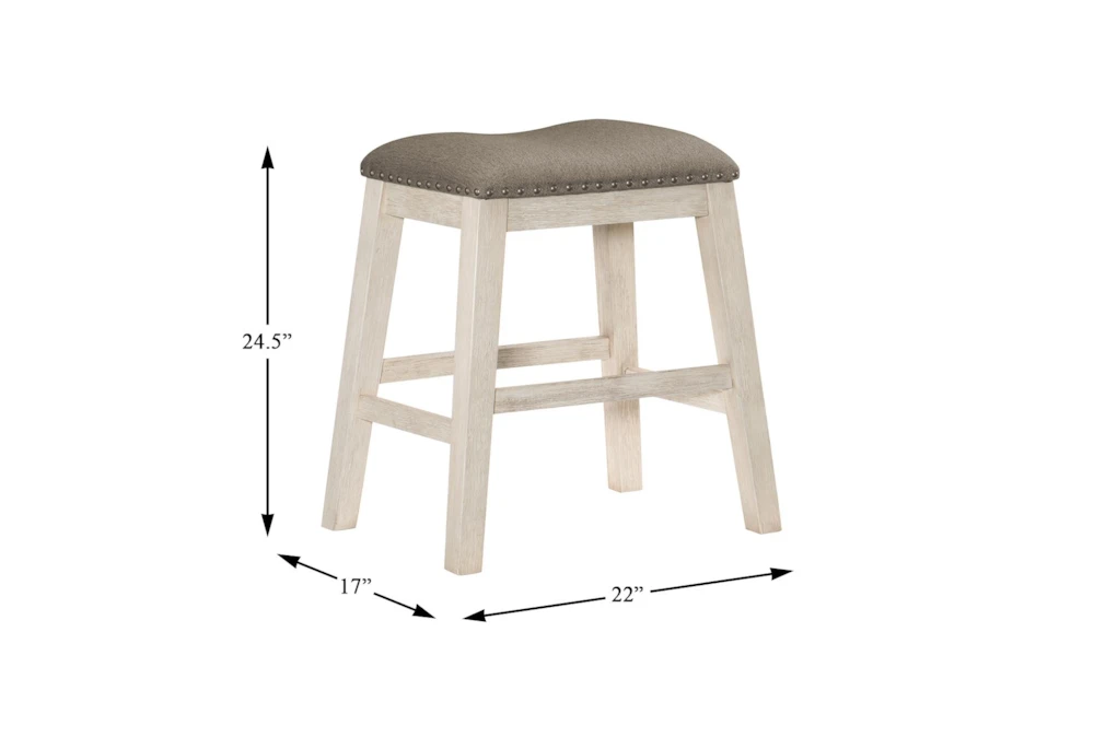 This Fideo White Counter Height Stool Set of 2 is a backless, rustic style stool made of solid wood with an antique white finish and faux leather cushion featuring nailhead detailing and tapered legs. Assembly is required for this set of two stools.