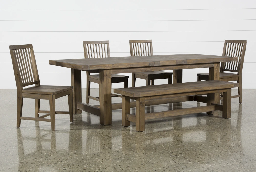 Bring the charm, quality and simplicity of wholesome Mission style to your dining space with our Gables dining set. Crafted of 100% solid pine, each piece is naturally beautiful and naturally sturdy. In addition to an extension table that expands to fit more guests, this set includes an inviting dining bench and slat-back dining chair.