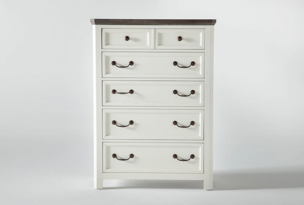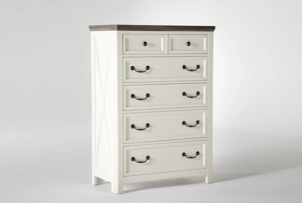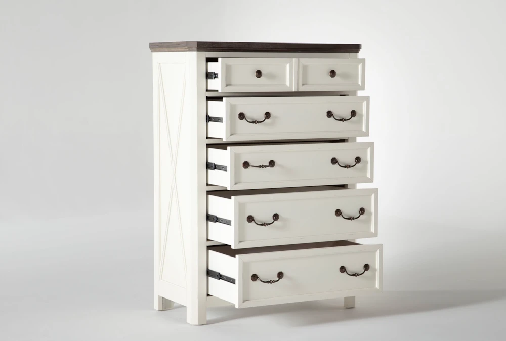 Prepare for things to get cozy in your suite with our Garland chest. Featuring farmhouse-inspired details, this design brings on the charm. Solid hardwood and oak veneers instill strength and character, while a two-tone finish, x-motif and weathered bronze hardware add a rustic element. Constructed for smooth, simple operation, the drawers boast French and English dovetail joinery and side-mounted, ball-bearing guides.