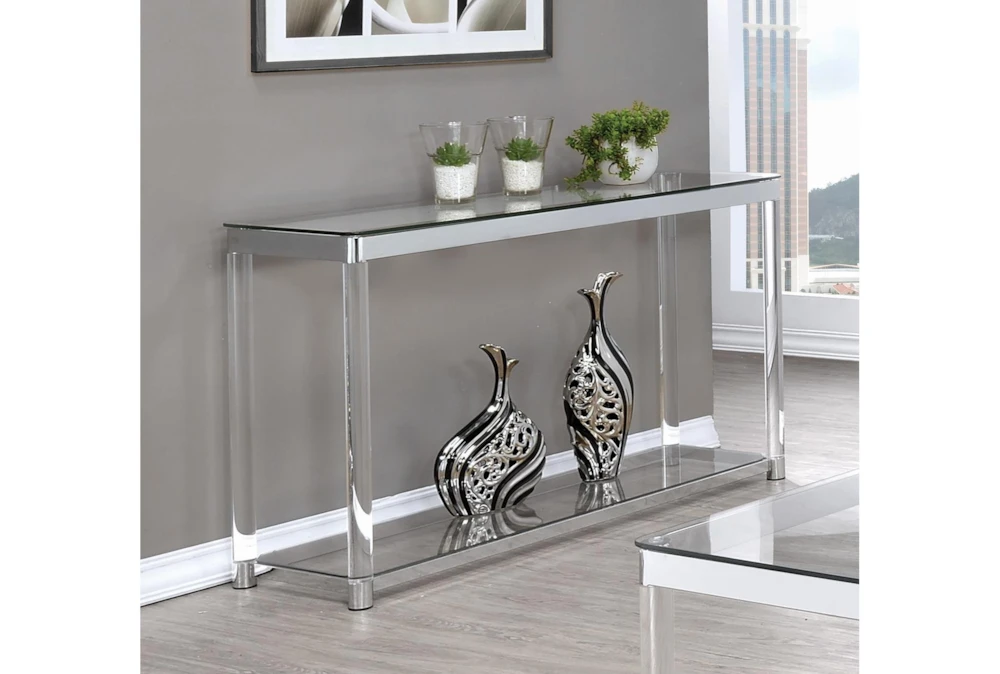 The Giselle Console Table is a sleek and modern addition to any living room, with a clear glass top and chrome accents. It features a convenient storage compartment, making it both stylish and practical.