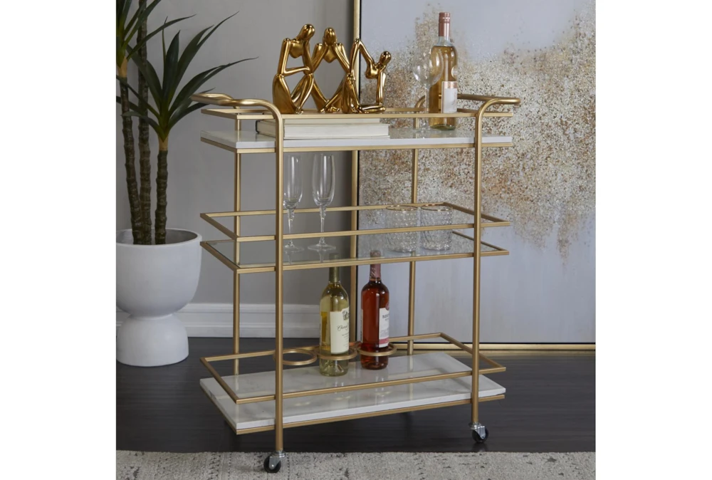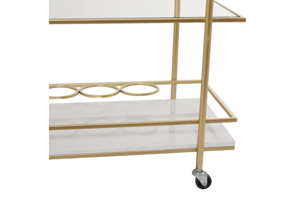 .This Gold Glam Marble Rolling Bar Cart is a modern and luxurious addition to any dining room, featuring storage and shelves with a wine rack, rolling wheels, and handles for easy mobility. Elevate your space with the combination of marble and iron materials, polished gold and cream finish, and 3-tiered design including dedicated wine bottle holders.