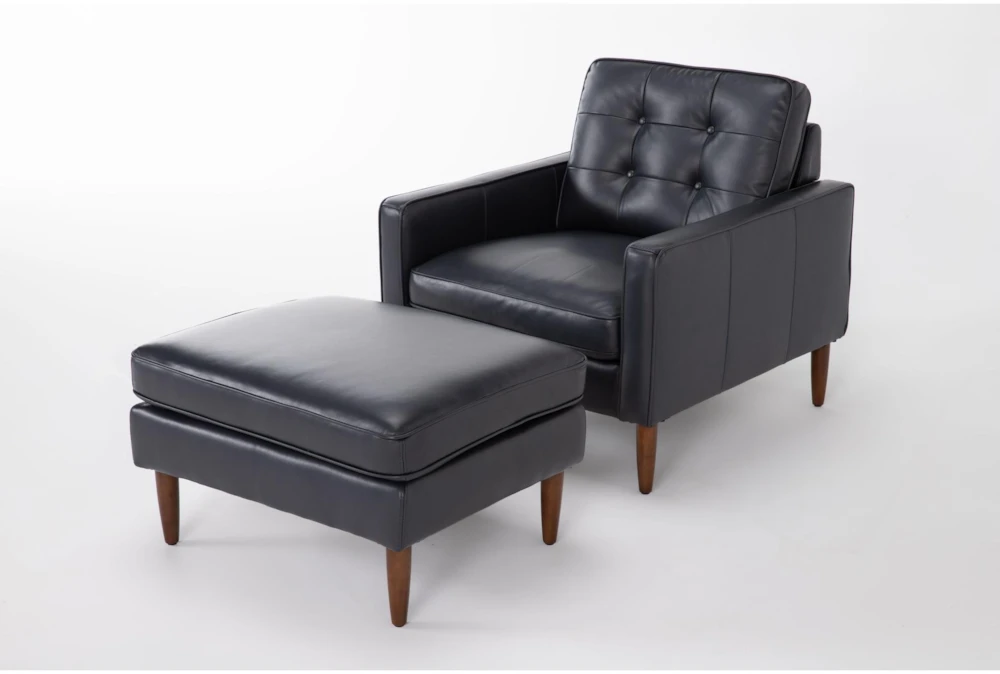 Get a high-end look for less with our Grayson leather collection, which exudes modern sophistication while providing irresistible comfort. Luxurious leather seating sets the stage for five-star lounging, and elevated style details add a sense of finesse. You’ll adore the button tufted backs, cone-shaped legs and thin track arms that bring mid-century flair, plus a deep navy blue/grey hue that enriches each piece. Designed for small space living, these are perfectly scaled for apartments and condos.