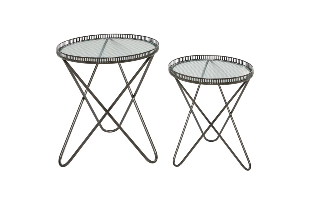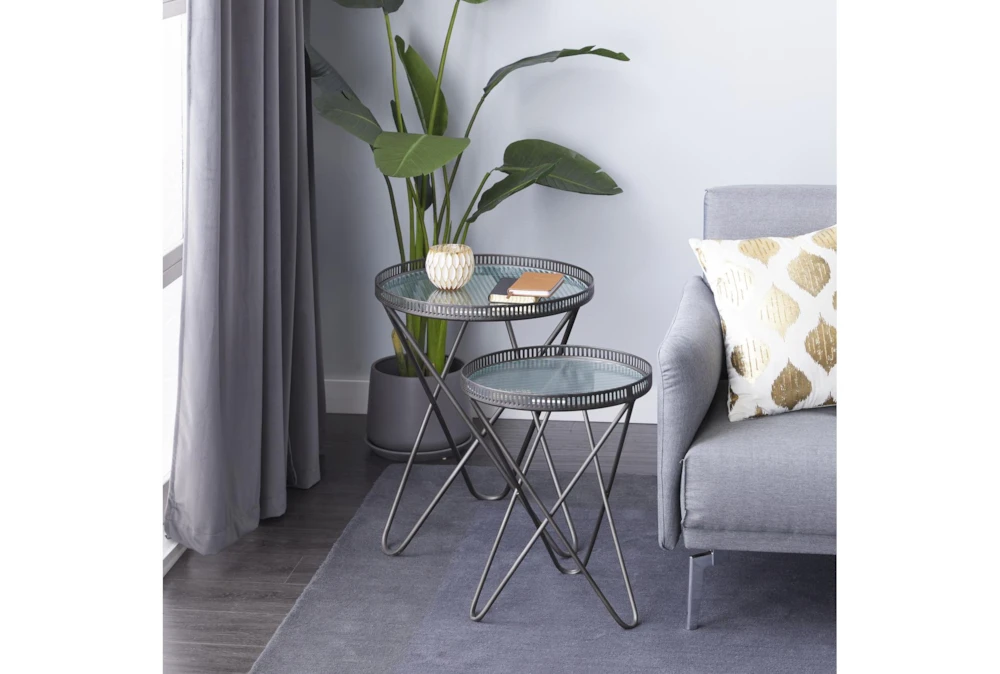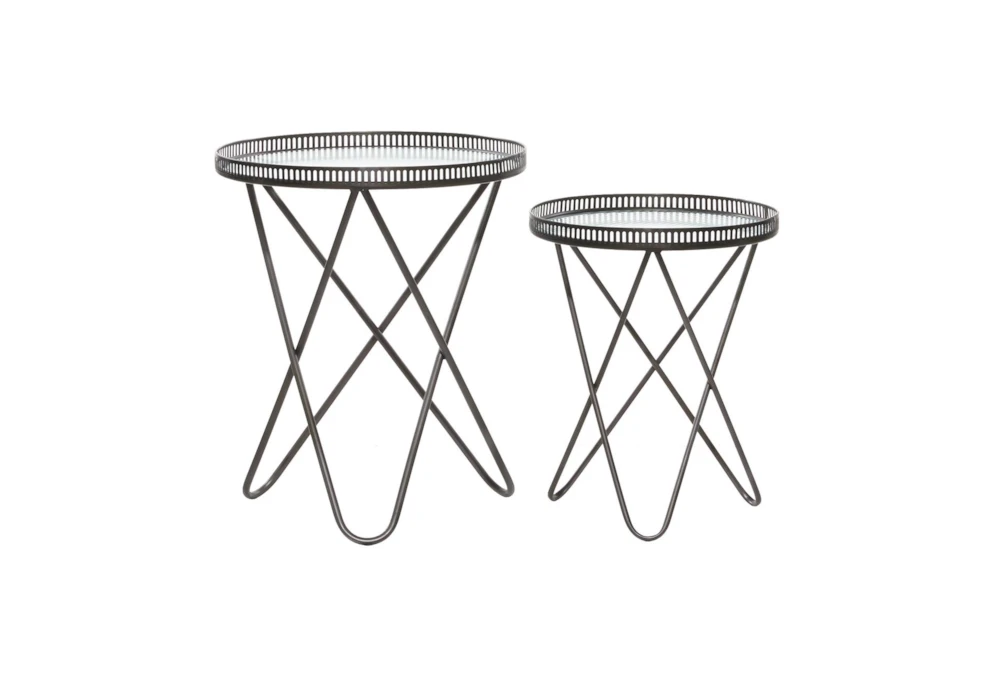 This Grey Iron Accent Table Set of 2 exudes modern charm with its sleek metal construction. The set includes two tables that offer a stylish and functional addition to any home decor.