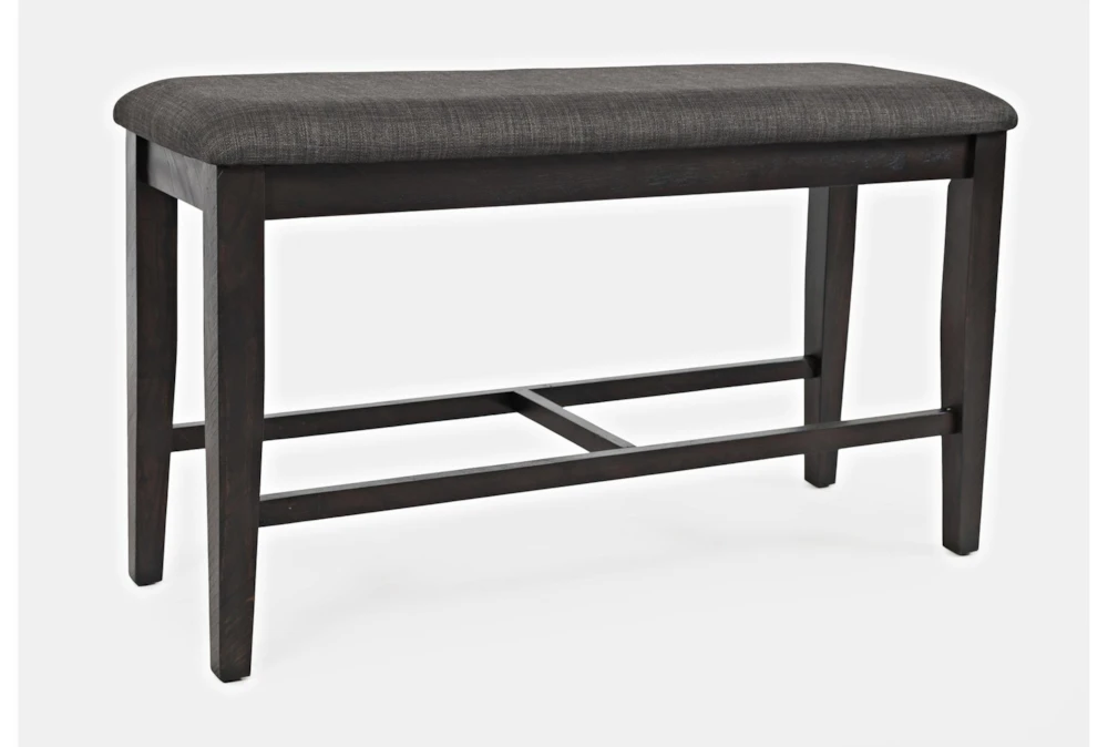The Henley Upholstered Counter Bench is a tall, armless piece designed in rustic style. It is made of solid acacia and veneers with an upholstered seat in brown fabric, perfect for any dining room.