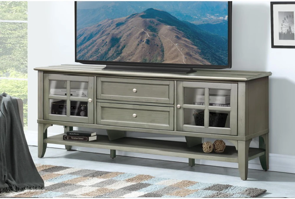 The Highland 76″ TV Console is a grey, casual-style piece made of wood and glass. It features tall doors with adjustable shelves, glass doors, dovetail drawers, cord management, and plenty of storage in vintage antique moss finish.