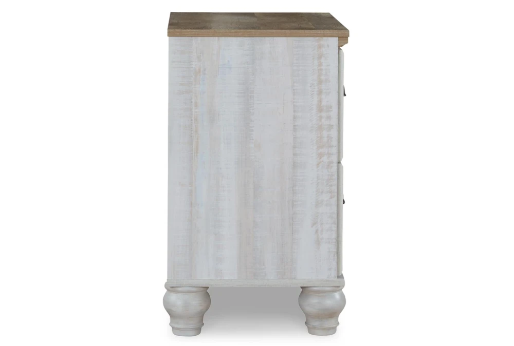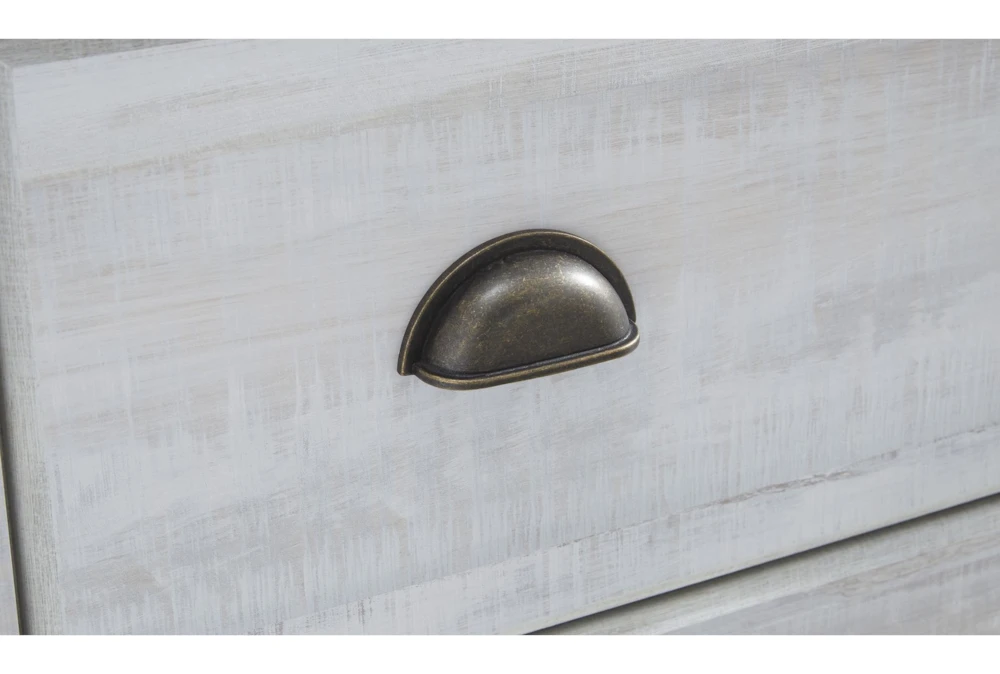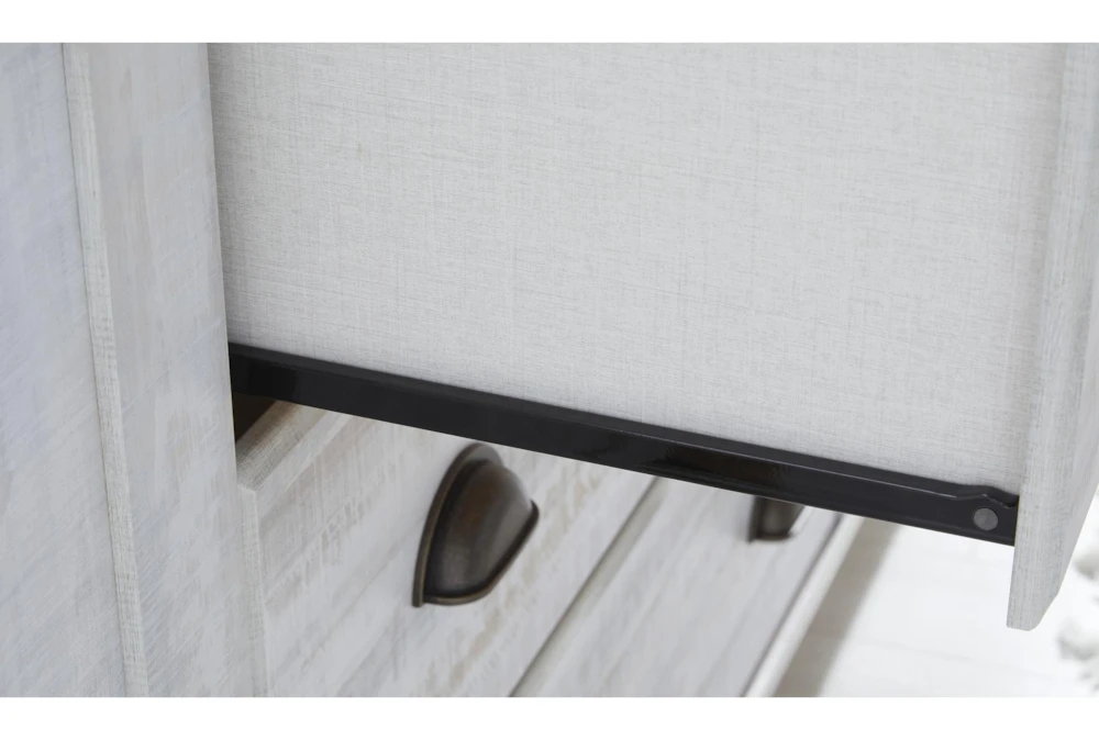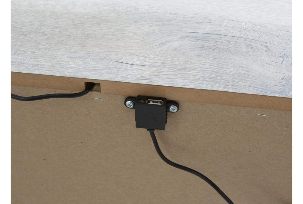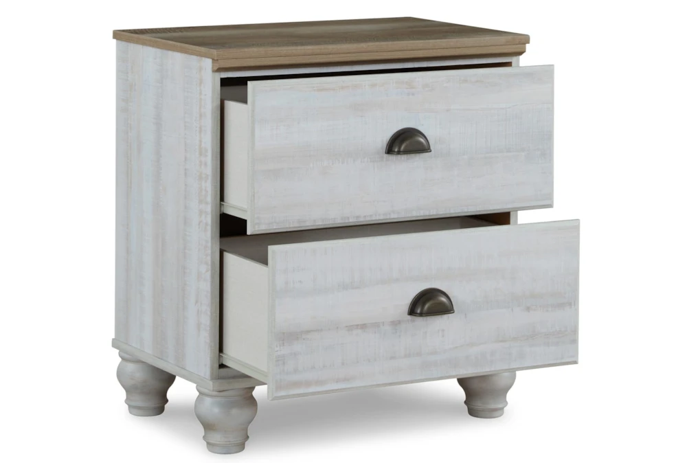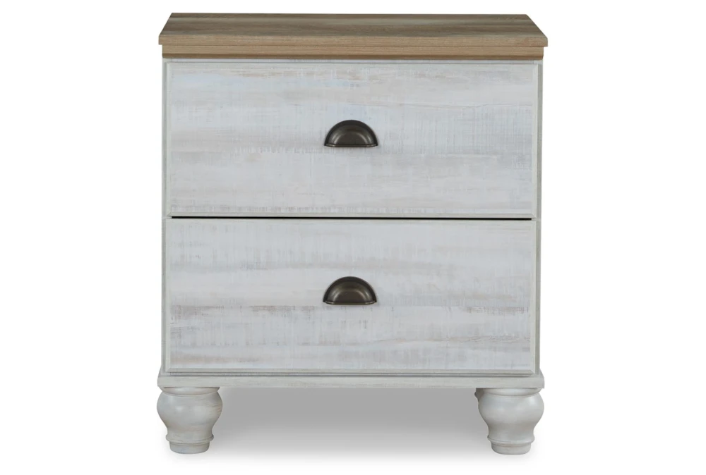 Made with engineered wood and decorative laminate. 2-tone look, weathered white finish and replicated oak grain. Dark bronze-tone hardware. 2 smooth-gliding drawers. Drawers lined with replicated linen. Slim profile USB charging parts.