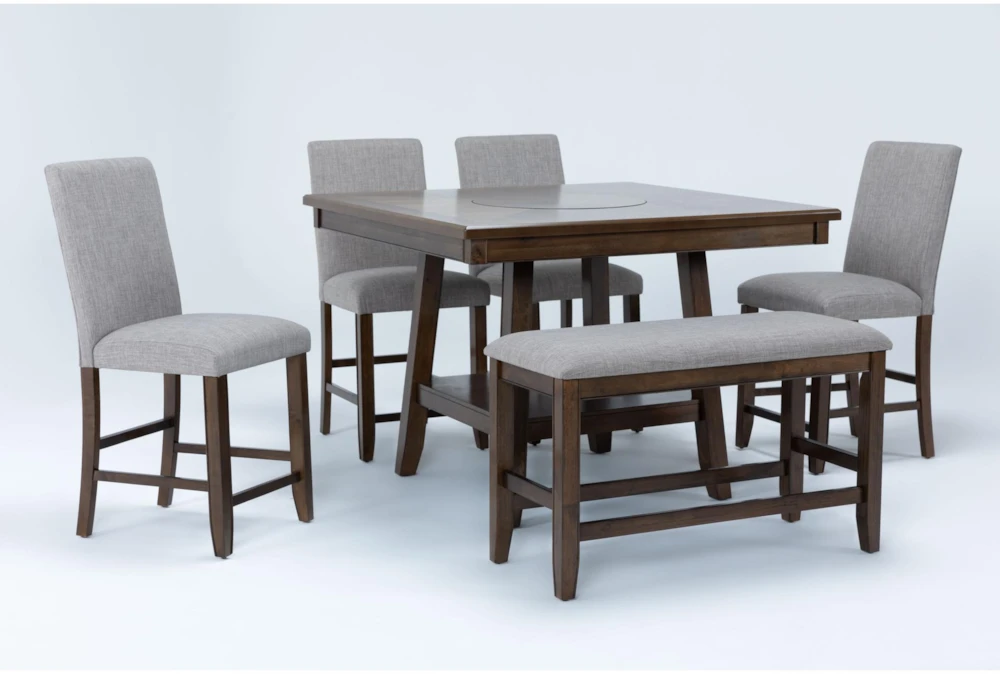 The new trend in entertaining, counter height dining reaches perfect elevation with our Hyland collection. Lofty and sturdy, this counter table features a built-in Lazy Susan for easy serving and a bottom shelf for convenient storing. You and your guests will love eating, drinking and gathering here.