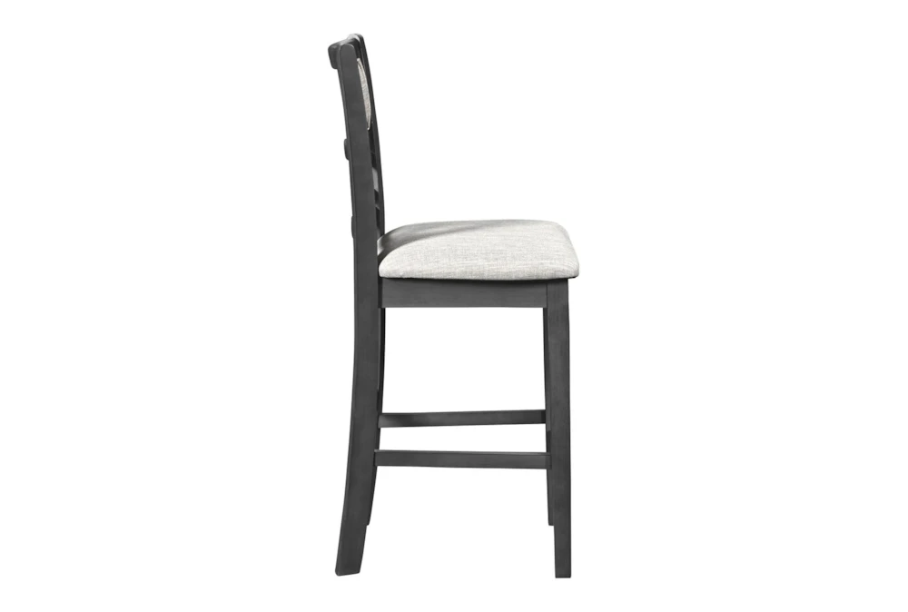 The Joni Grey Round Counter Set is a 5-piece dining set with a casual style, made of wood and featuring a 42 inch round table with storage, shelves, and four armless chairs. Assembly is required.