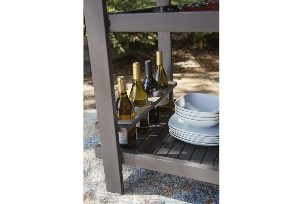 Elevate your outdoor dining experience with the Kail Gray Outdoor Serving Bar Cart, crafted from premium wood in a traditional style. Its versatile design and sturdy construction make it a must-have addition to your dining room, providing ample space for serving drinks, snacks, and meals.