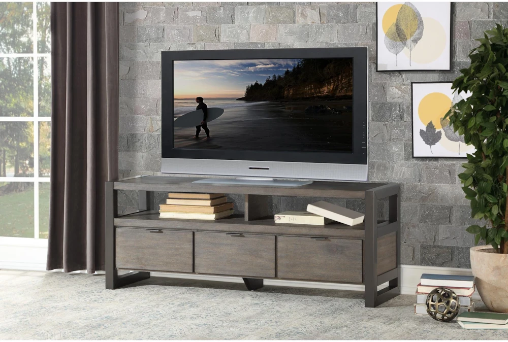 This Lakeshore 58″ TV Stand is a casual style piece made of wood, perfect for your living room. It features ample storage with drawers and shelves, as well as a dedicated soundbar shelf for an enhanced viewing experience.