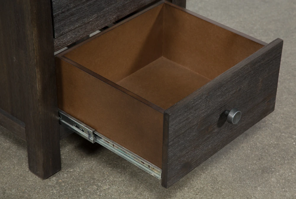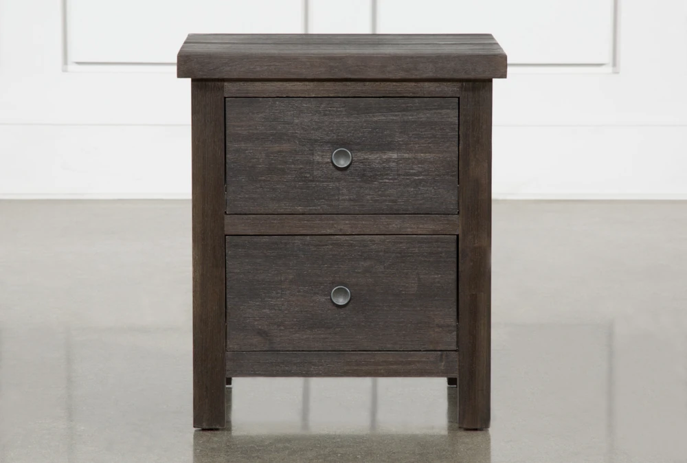 Our Larkin nightstand brings simplicity, versatility and ease to your space for less with its streamlined design. This rich espresso piece is crafted with solid wood and acacia veneers, and it features a 5-step wire-brushed finish and custom antiqued metal handles. The full-depth drawers with ball-bearing glides ensure reliable, roomy storage for clothes and essentials.