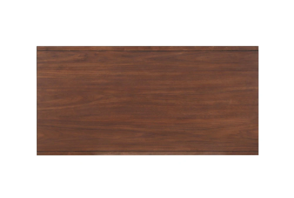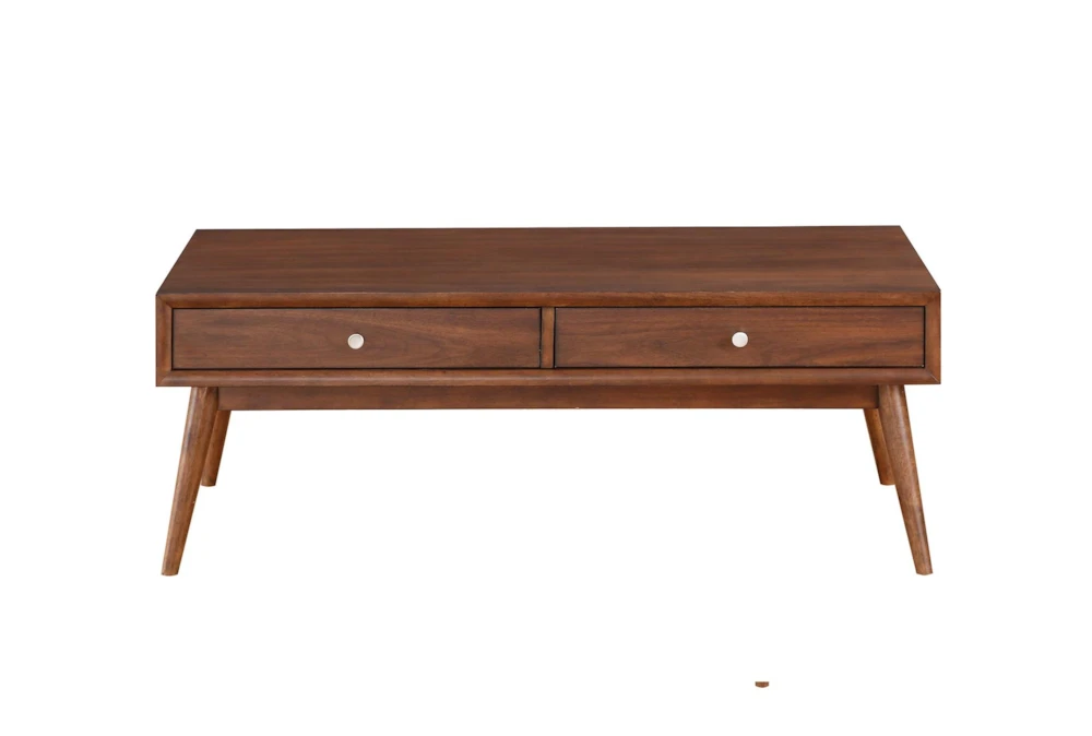 The Leslie Mid-Century Coffee Table is a modern-style piece with storage and two dovetail drawers with ball bearing glides, complete with polished nickel tone knobs, in a beautiful brown color. Made of durable rubberwood, assembly is required for this functional and stylish addition to any living room.
