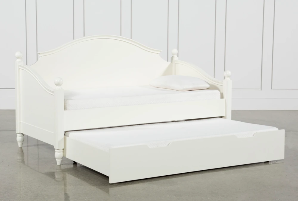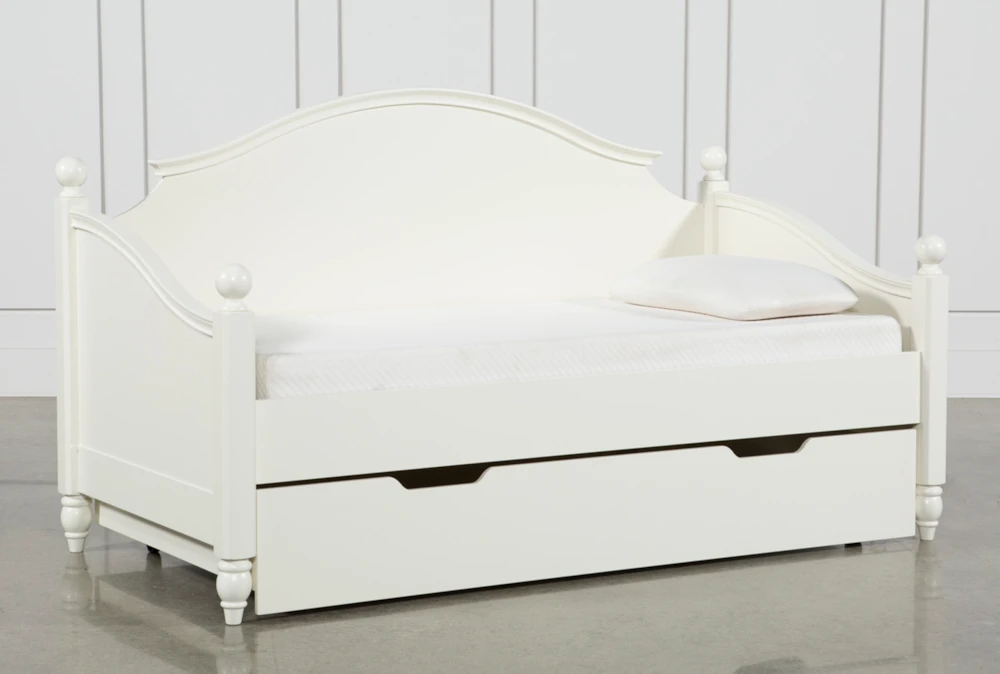 Kids, teens and parents will all discover something to adore about our Madison White twin daybed with trundle, from the graceful style to the incredible value. Designed to be the heart and soul of the bedroom, this piece boasts solid poplar wood construction and corner blocking to ensure long-lasting quality, safety and structural integrity. There’s even a trundle bed that stores conveniently underneath, so you always have an extra place for guests.