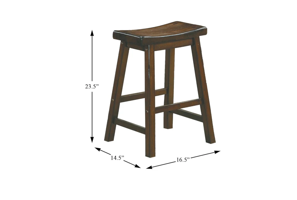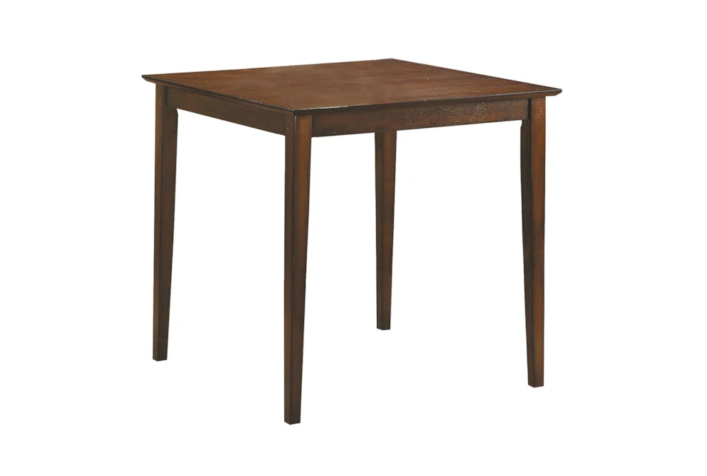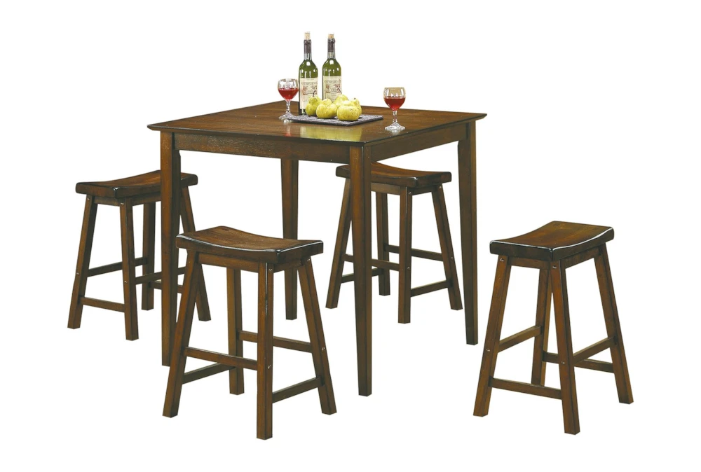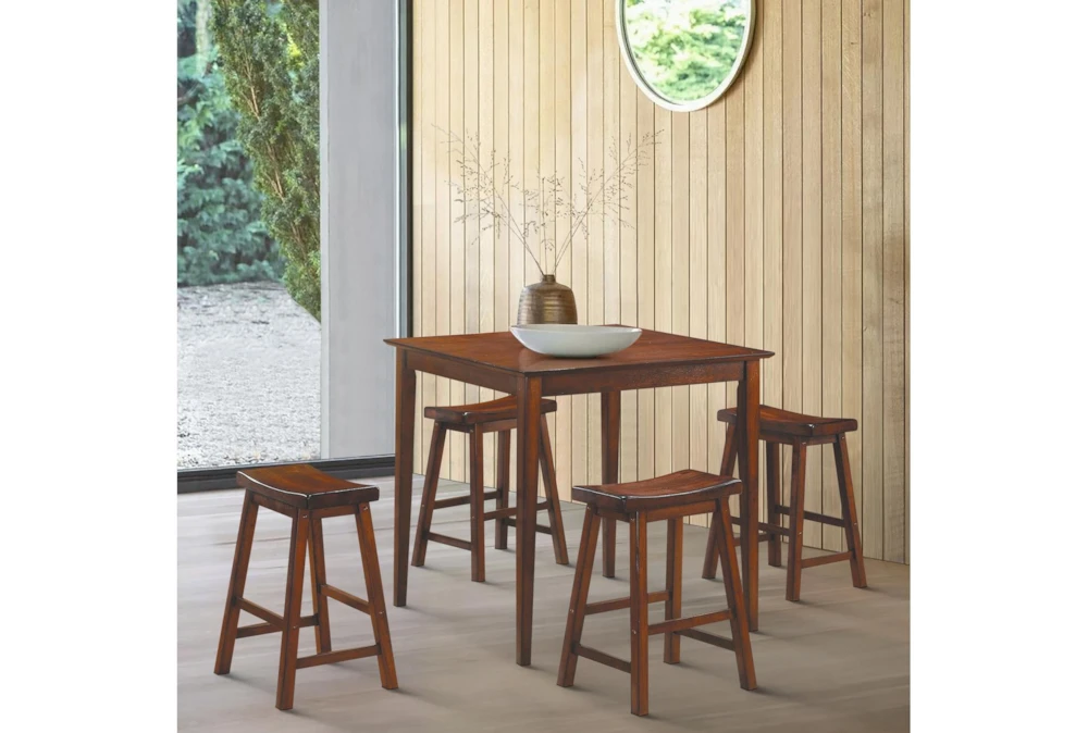 The Marcel Brown Counter Set is a rustic-style, 5-piece dining set made of solid wood with a brown cherry finish. The tall chairs are armless and backless, and assembly is required.