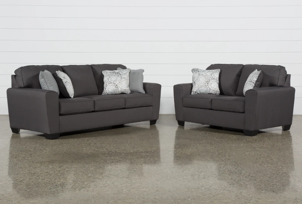Lounge for less with our McDade graphite 2-piece living room set, which will be your home’s main style and comfort attraction. From the tailored, modern look, to accent pillows that add a little flair, there’s plenty to love about these designs.