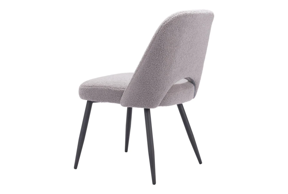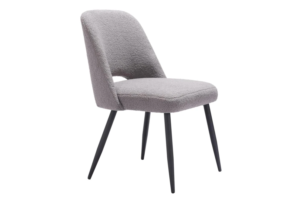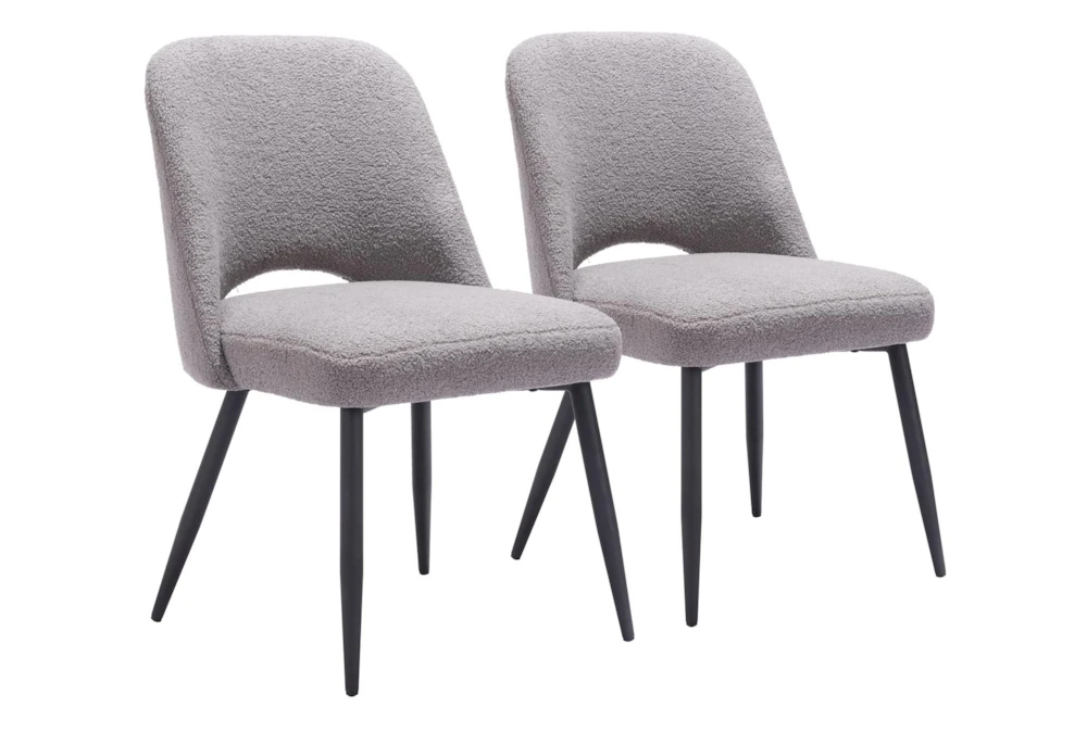This set of 2 modern grey dining chairs features a curved design, armless construction, and a supportive back. The chairs are made from a combination of metal, wood, and fabric, and require assembly.