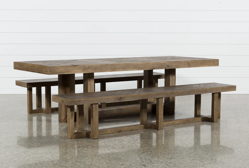 From the natural quality, beauty and authenticity of solid pine, to clean, architectural lines, to on-trend parquet features, our Palazzo 3-piece dining set blends the best of rustic and contemporary styles. The dining table and bench are distinguished by grand proportions and all solid hardwood construction, with plywood elements to ensure consistent shape and stability. Parquet and chevron patterns add unique geometric flair, while rough-hewn surfaces that showcase knots, bandsaw marks and other ingrained characteristics enrich each item’s one-of-a-kind charm.