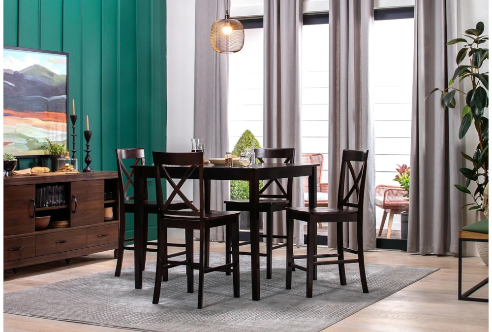 Those charming x-back stools, that clean, streamlined table, the beyond phenomenal value – it’s no wonder this set is so popular. In addition to the immediately discernible perks, our Percy dining collection raises the bar for entertaining thanks to its counter height designs. The hardwood and veneer pieces also boast an espresso finish, which enriches their appeal and complements every meal.