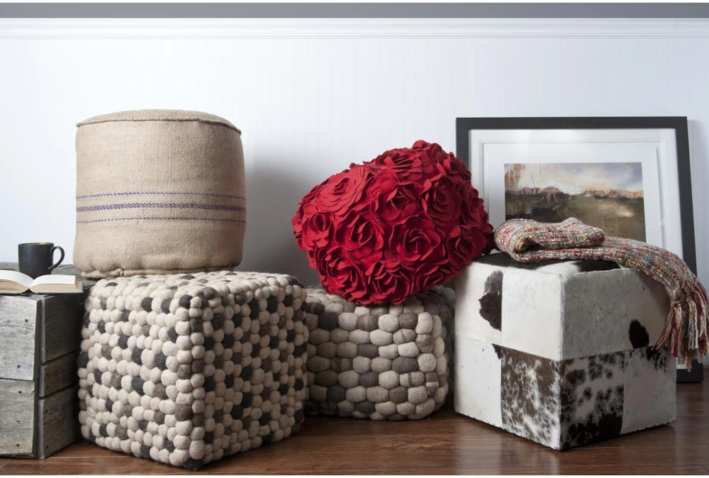 This modern pouf, made from high-quality fiber, is adorned with stunning red felted appliqued flowers. It is both stylish and practical, making it the perfect addition to any room.