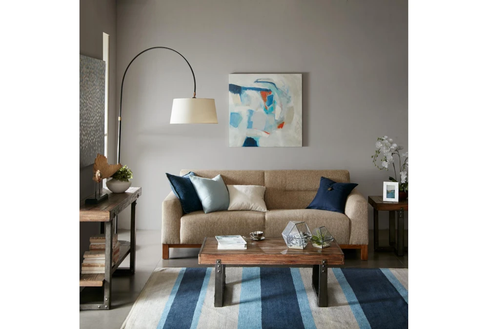 The Russell 48″ Console Table is an industrial-style piece made of composite material in a brown color. Assembly is required for this table, which features a metal tubing frame with MDF and elm veneer and a metal Cody finish. The wood finish is heavily distressed, making it a great option for small spaces in a living room.