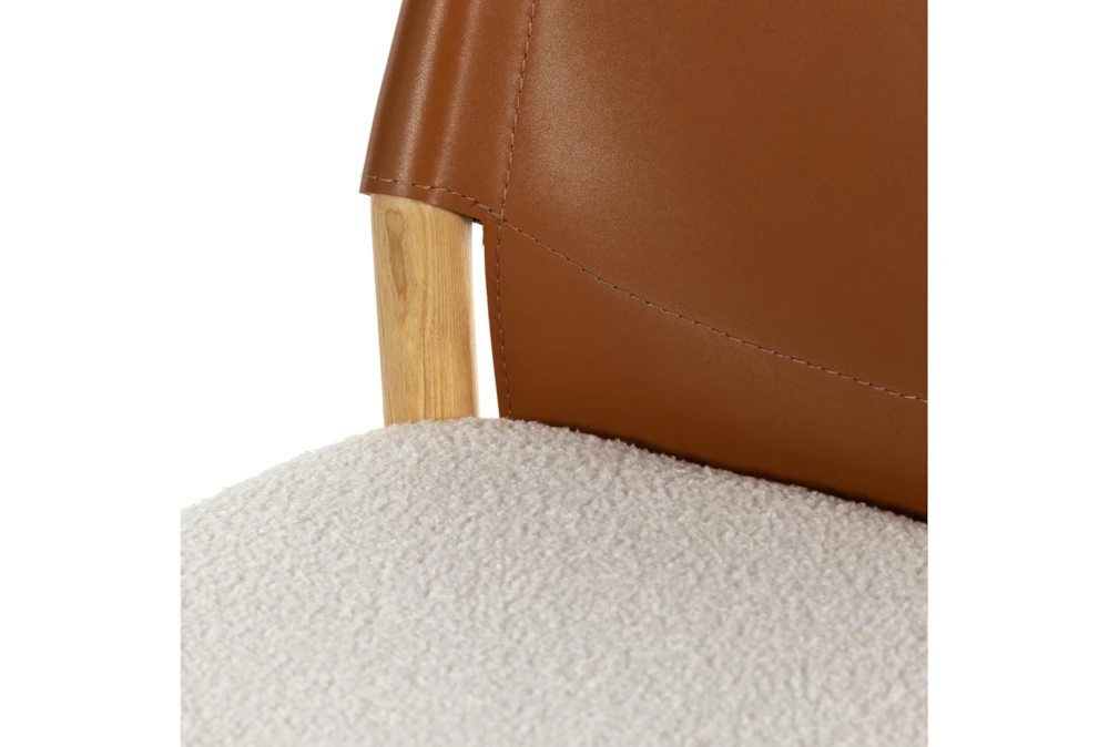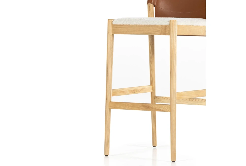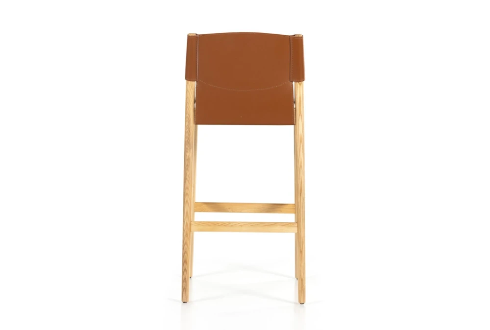 This Saddle Leather Bar Stool is a modern style armless stool made of 70% leather and 30% PVC with a solid ash and polyester secondary material. It is designed for use in the dining room and features a brown color.