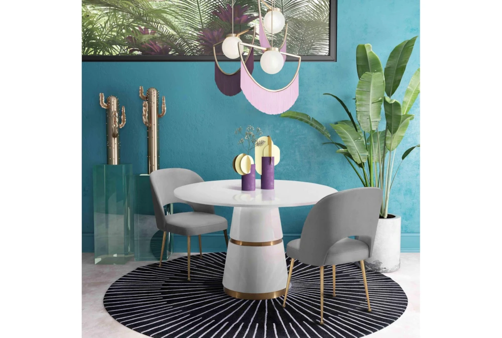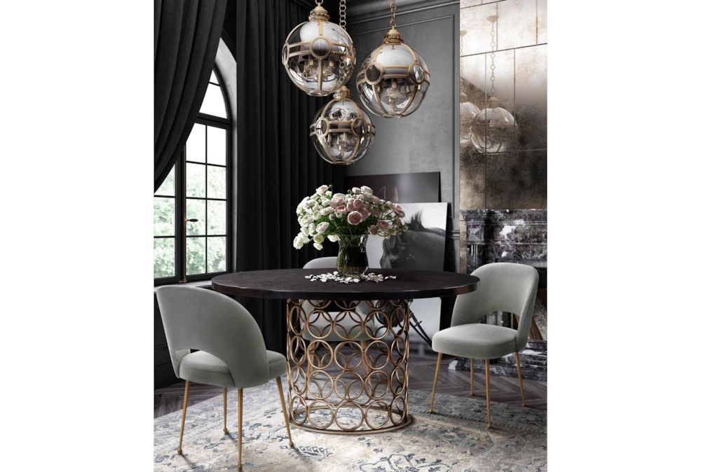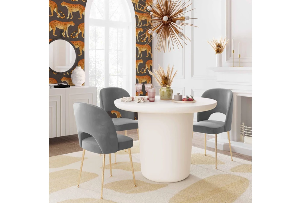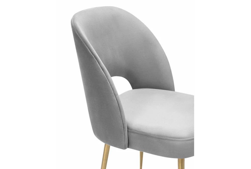 The Shirley Light Grey Velvet Dining Chair is a modern-style piece made of fabric and metal, perfect for the dining room. Its sumptuous velvet upholstery and handmade stainless steel gold legs make it a luxurious addition to any dining space.