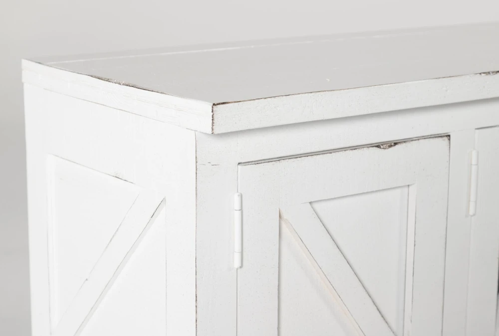 A casually distressed finish gives the Sinclair TV stand its charming weathered texture and reveals the natural beauty of a streamlined solid pine design. Ethereal in white, the piece is adorned with understated pewter hardware.
