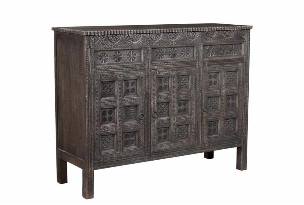 This Square Motif 57″ Sideboard boasts a rustic style and is crafted from durable wood with a sleek black finish. Its spacious design offers ample storage that will keep your home organized and clutter-free.