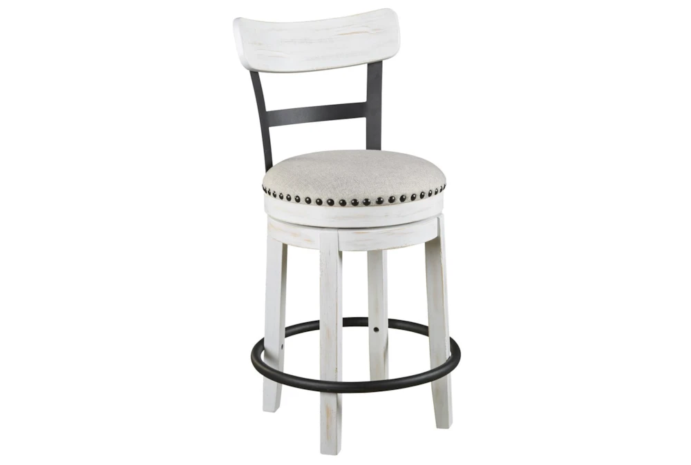 The Vale White Uph Swivel 37″ Barstool is a casual-style barstool made of wood and metal with a swivel feature, 360 degree swivel capability, and upholstered seat. This stool is perfect for a small space dining room and requires assembly.