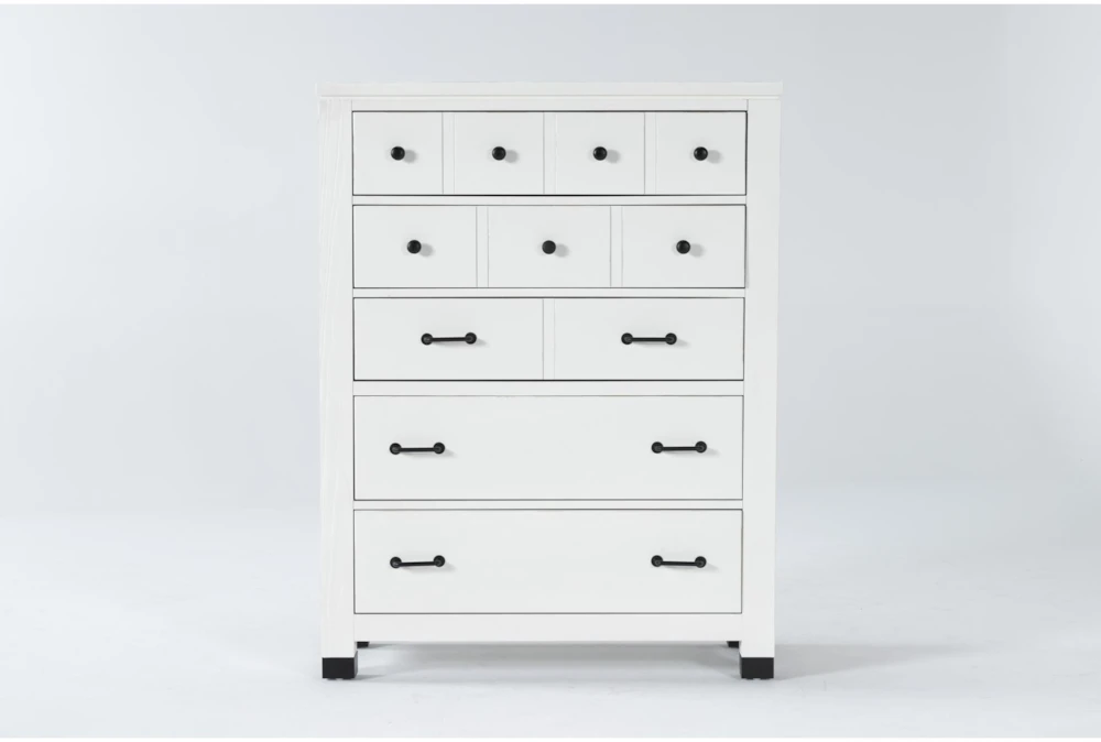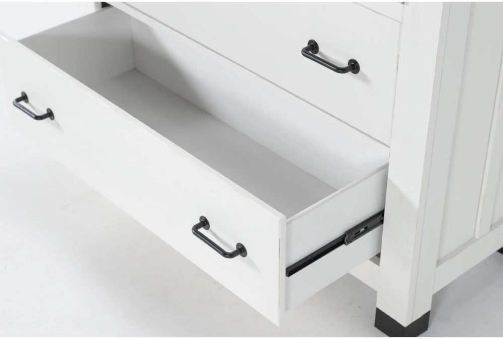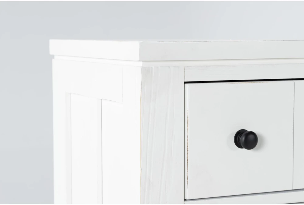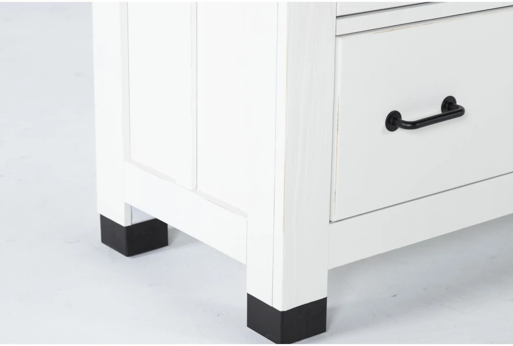 When it comes to bringing charm, character and function to your retreat, no collection does it better than our Wade bedroom designs. Enriched by farmhouse features, these pieces offer inviting style, quality construction and a combination of hardworking materials. In addition to solid pine and pine veneers in a silo white finish, you’ll find metal elements in a forged iron finish. Drawers with French and English dovetail joinery and side-mounted ball-bearing guides ensure smooth operation, while details like USB ports in the nightstand and touch LED lighting on the storage bed incorporate convenient smart technology.