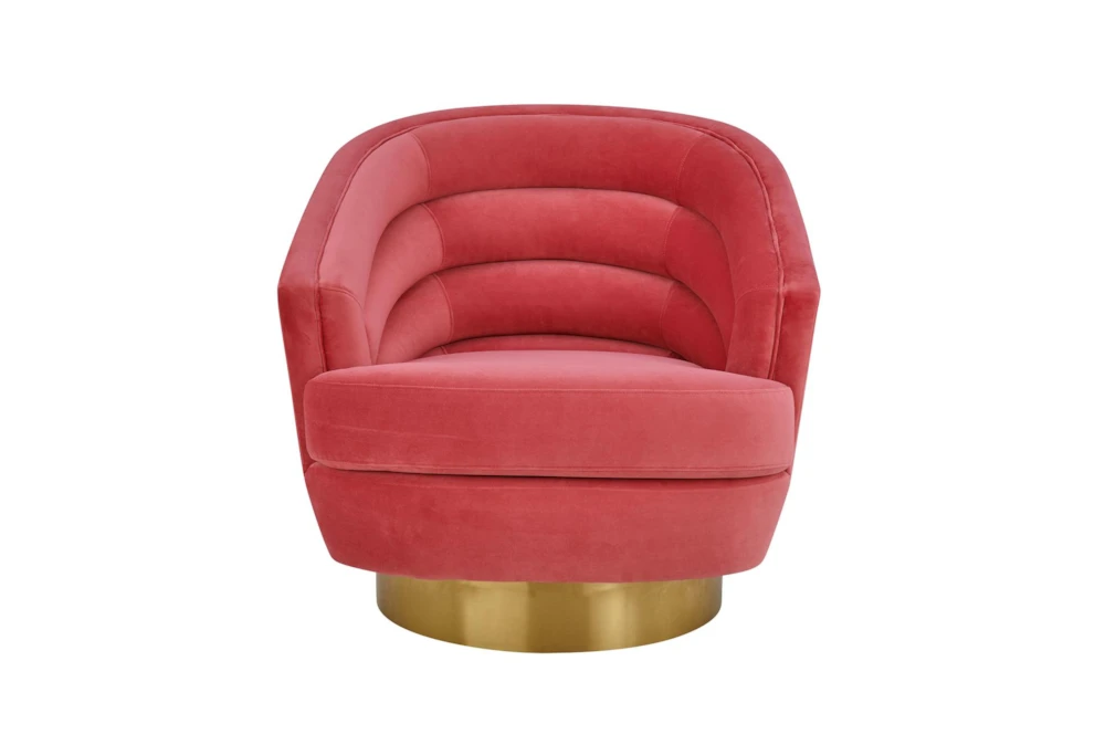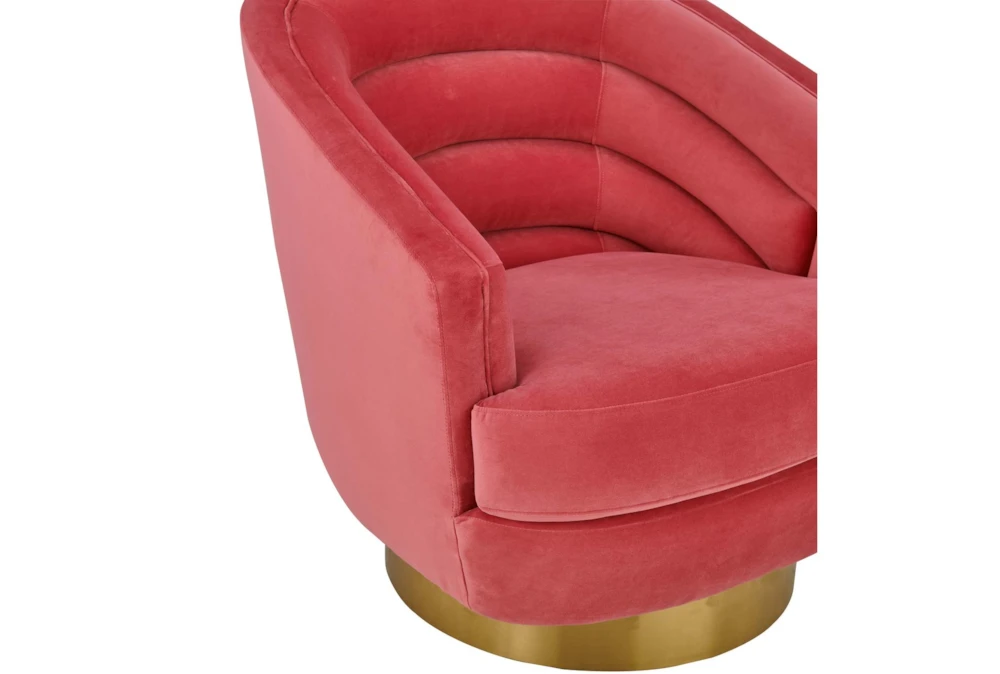 The York Hot Pink Velvet Swivel Accent Chair is a contemporary-style indoor chair with a handmade elegantly curved design, 360-degree swivel, and channel tufted pink velvet cushion. The chair is made of fabric and metal, comes fully assembled, and is perfect for use in living rooms or bedrooms.